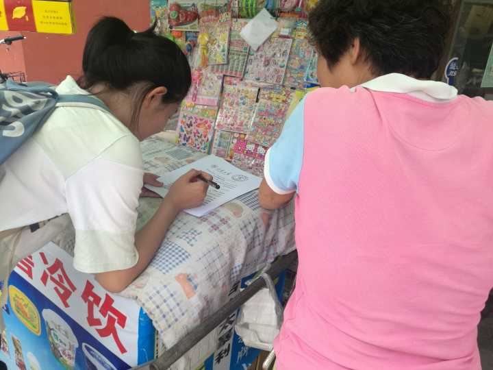 调查的对象初步设定为路人,但是绝大部分的人因为时间匆忙拒绝了,活动的开始遭到巨大的困难,所以组员改变了调研对象,开始对小区店铺内的职员进行相关问题的调研,情况取得了部分的改善,由于是上班时间职员的工作比较繁忙,所以情况依旧不容乐观。炎热的天气下组员们在小区内转了一遍又一遍,衣服全都湿透了,组员们经过长时间的跑动与劝说明显有些不耐烦,组长自费给组员们买雪糕等解暑食品以资鼓励。组员们互相鼓励经过五个小时的艰苦奋斗终于达到了目标量。所有填写调查问卷的人都特别的认真,尽管一些姐姐或者阿姨比较害羞但仍然写出自己内心的真实想法,组员向支持工作的她们表达最诚挚的感谢。