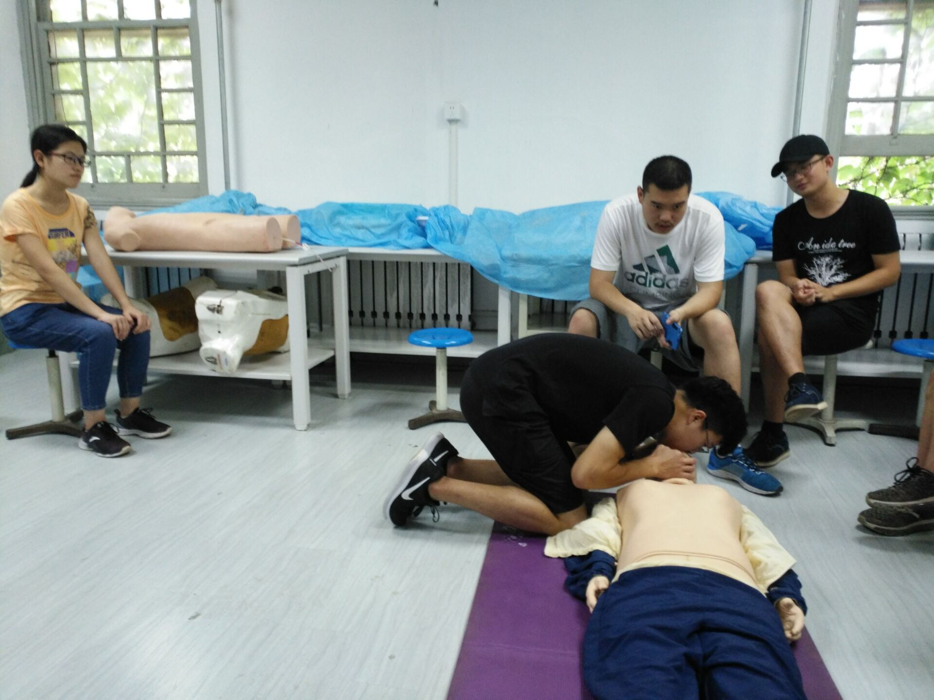 在大家都掌握了理论知识之后,老师安排队员们使用假人轮流进行练习。在此期间,队员们互相计时以便调整胸外按压的频率,队员们也互相观察着动作不到位之处并加以指出,队员们相处十分融洽,在学习中共同进步。值得一提的是,虽然天气炎热,队员们仍是专心练习,没有一句抱怨,这种求学精神获得了老师的称赞。