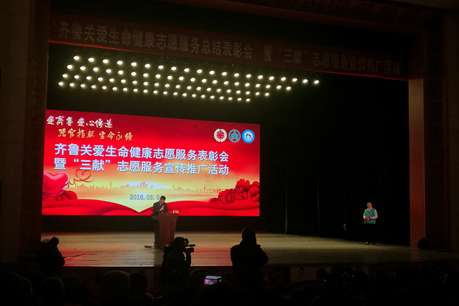 3月4日,在全国第55个学雷锋日到来前夕,济南市红十字齐鲁关爱生命健康志愿服务队在山东剧院举办“齐鲁关爱生命健康志愿服务表彰会暨‘三献’志愿服务宣传推广活动”。山东省红十字会党组书记、常务副会长李全太,济南市红十字会党组书记朱兴利、山东大学齐鲁医院党委副书记、纪委书记苏华,济南市红十字会副巡视员兼秘书长李宁、山东省红十字会事业发展部部长王永君,中国人体器官捐献管理中心宣传部部长张珊珊,省机关党委、省文明办、省妇联、省外办等相关单位领导参加活动。“1st-aid”社会实践队王明非、崔宇博应邀参加本次会议。