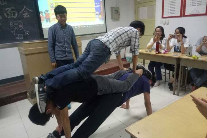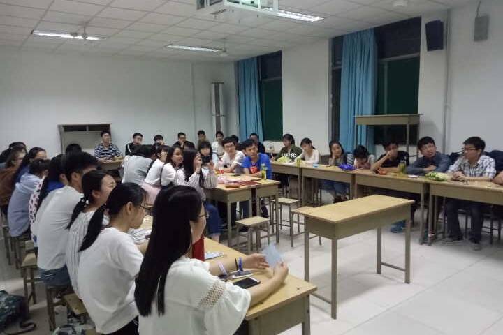 重头戏当然是新成员的自我介绍以及穿插的抽奖活动了。同学们依次上台做了自我介绍,让大家更进一步得了解了未来的小伙伴。热情的前辈们为大家准备了许多零食,大家一边享受美食一边参与到活动中,教室里的气氛十分融洽。其间,薛志伟还通过微信抽奖、摇一摇等方式发放了充电宝、笔记本和德芙巧克力,得到奖品的幸运儿都喜笑颜开。还有个别同学进行了歌曲、舞蹈表演,甚至有3名学弟展示了叠罗汉俯卧撑,嬉笑之中每个人都融入了这个温馨和谐的大家庭。