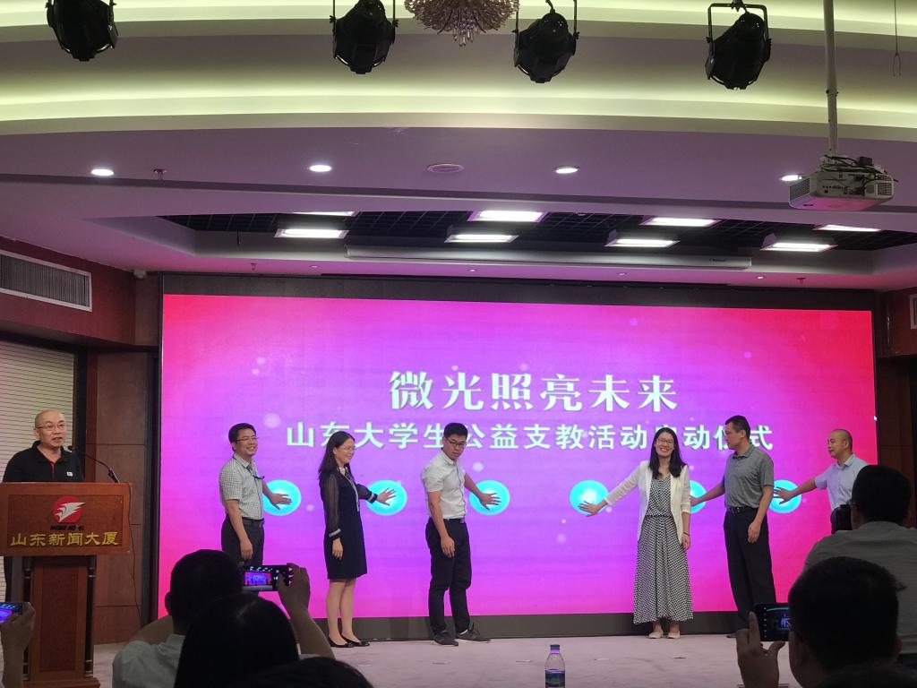 2时,启动仪式准时开始,主持人对到场领导和嘉宾进行介绍,并宣布启动仪式开始。随后,齐鲁晚报常务副总编辑、日新传媒董事长胡忠华进行了致辞,表达了对暑期支教大学生们的感谢和大力支持,送上了自己对大学生支教活动的祝福,并对齐鲁晚报和齐鲁壹点以及“微光照亮未来”进行了介绍,鼓励支教大学生向齐鲁壹点投稿自己支教的经历和感悟,让更多人了解支教工作和贫困地区的教育情况。山东省福利彩票发行中心副主任孙明伟和菏泽市定陶区万福集村“第一书记”李渤发表讲话,预祝大学生暑期支教顺利进行,并表达了对大学生收获良多的殷切希望。紧接着,山东大学团委副书记翁祥栋进行讲话,对组织者表达了诚挚的感谢,并介绍了山东大学学生支教工作的历史和现状,给予对大学生支教工作的大力支持。讲话结束后,吕长辉、孙明伟、李渤、胡忠华、翁祥栋、张刚等嘉宾上台点击触摸屏,“微光照亮未来”山东大学生公益支教活动正式启动。随后举行授旗仪式上台嘉宾为参加支教的各个团队进行授旗并合影留念。随后,支教学生代表山东大学学生赵天崧带领到场大学生宣誓,全体与会大学生起立并宣读承诺书,一声声铿锵有力的誓言表明了一百多名大学生坚定不移的决心和对改善贫困地区儿童教育的热情。