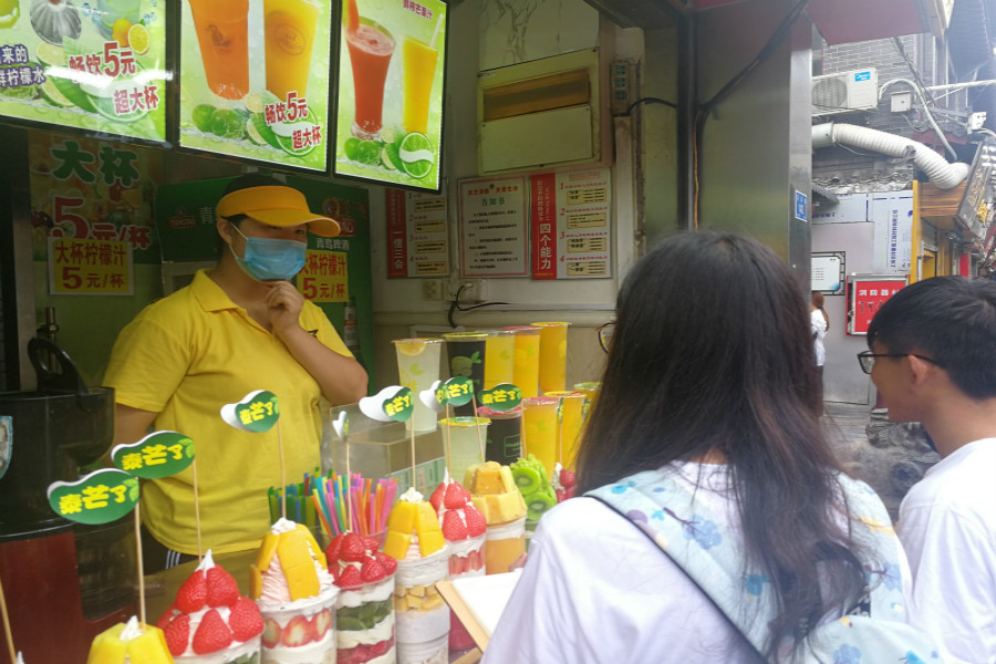 离开沃尔玛之后,我们又来到了济南有名的特色小吃街道芙蓉街。在这里,我们分别采访了台湾澎湖花枝丸、济南国足臭豆腐、醉得意、闪电泡芙、山东特产甜沫小店、老南京灌汤包、泰芒了、纯手工牛轧糖、老北京爆肚、会仙楼等小吃店的负责人,并向他们询问了食品的来源、加工程序以及对于如何保证食品卫生的问题。闪电泡芙的负责人告诉我们他们的泡芙每天都是现做现卖,卖完就关门,从来没有放过夜的情况出现,所以食品可以保证是非常安全的。我们还进入会仙楼的后厨观摩了他们腰花的制作过程,厨师说他们的原材料都是非常新鲜的,食品安全也很有保证。我们还在芙蓉街采访了一位喝着答案奶茶的顾客,他说自己也会关注食品安全问题,但他觉得既然大家都在喝这个奶茶,里面应该是不会有什么问题,但也需要更加小心谨慎。