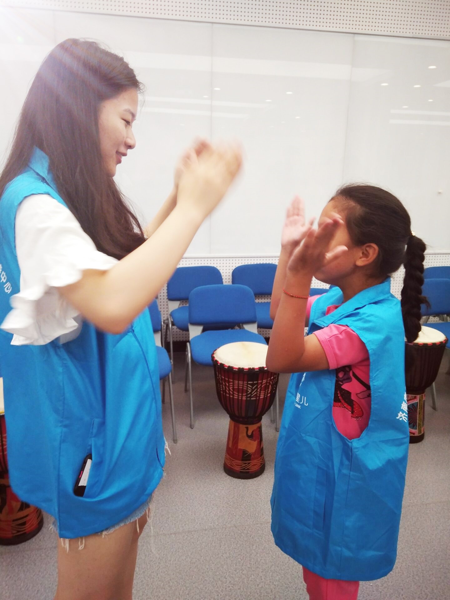 春晖星儿家长支持中心的朱老师一边敲打节拍一边指挥孩子们按照对应的节拍做出相应的指令。实践队的成员们则在一旁耐心地指导孩子们,对孩子们进行及时的点拨和帮助。孩子们极为聪颖,他们中的大多数人能够正确地理解老师的要求并做出正确的指令。教学与游戏穿插进行,在大家击鼓感到疲惫之余,实践队的队员们带领孩子们一起做游戏,他们鼓励孩子们歌唱自己熟知的儿歌。小朋友的表现也令人惊叹。有一位小朋友所演唱的游子吟,歌声清亮,感情真挚,赢得了阵阵掌声。随即,队员们播放乐曲伴奏,在唯美的旋律中,成员们和孩子们时而相互击掌,时而携手起舞。欢乐的氛围溢满了教室里的每一处角落。