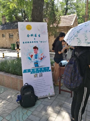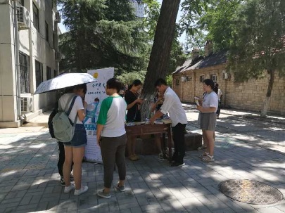 6月28日中午,暨全科医生第一次调研活动结束,对访谈结果进行分析整理后,5-HT实践队于当日正式开始了对于大家对全科医生的了解程度调查活动,在最后一次确认问卷信息准确无误后,实践队分为展台联络组和传单发放组分别进行宣传活动。