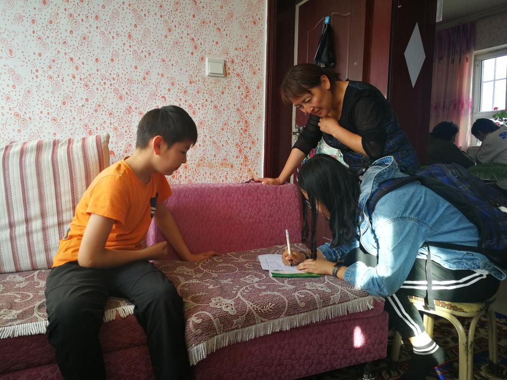 放学后,Dr.异乡人组织了另一个重要的活动-家访,此次家访分别在中班与大班学生家庭中进行。中班负责家访的人员是地娜和李柄林,他们一行两人去了恩卡尔、叶森等四名同学的家;大班由刘仁宇、李韵珊、江波塔等负责,一行3人去了阿依江、阿依暑阿克两家进行了“家长对孩子了解程度”的调查问卷得到了家长很大的支持,并对此次举办暑期补课与家访活动的支教队成员表示了衷心的感谢。热情好客的家长邀请队员们留在家里喝茶,边喝茶边聊天,家访活动进行得非常顺利。