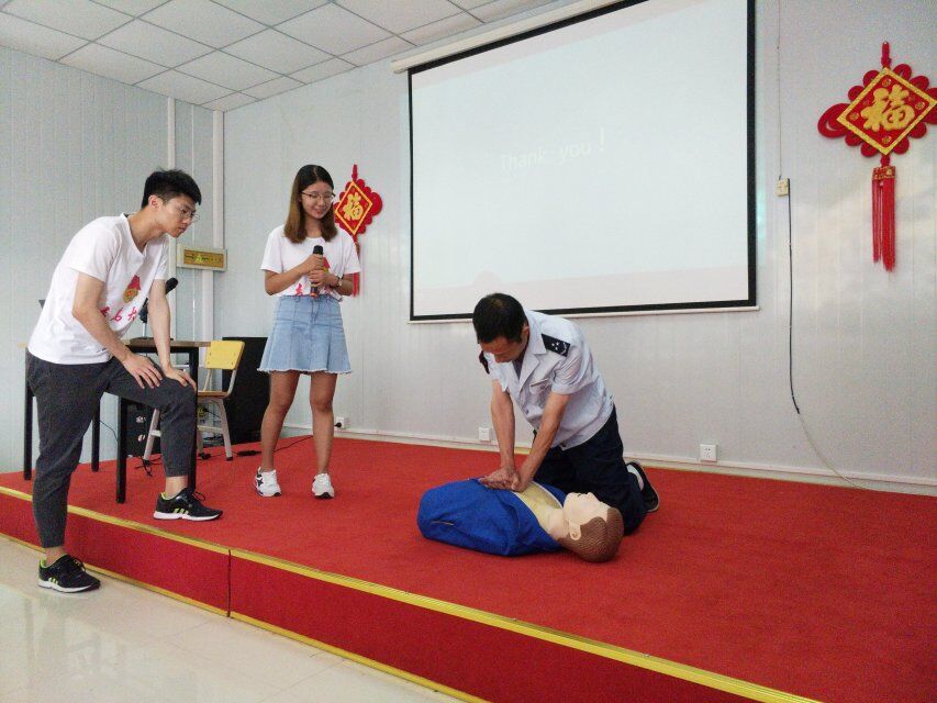 宣讲会伊始,青岛大学的同学为职工们讲解了溺水、脑卒中和气道梗阻等夏季常见病的急救方法,纠正了“溺水时需要控水”“给脑卒中病人吃药喂水”等常见误区,还生动形象地演示了海氏急救法。随即,山东大学We Do 社会实践队队员从心肺复苏的目的是阻断从“临床死亡”向“生物学死亡”过程讲起,到实施心肺复苏的“黄金四分钟”概念,再到CPR适用人群,全面阐释了心肺复苏术的理论知识。另一队员则将“叫、叫、C、A、B”的口诀作为框架,详细地说明CPR的实际操作步骤。而后,青岛大学医诚志愿服务团两名成员以标准流畅的操作为职工们做出示范,同时补充了一些应当注意的细节。过程中职工们反应热烈,踊跃提问,还有许多人走上讲台,亲自实施CPR。