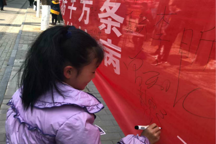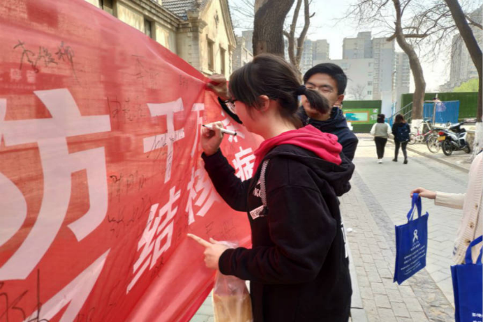 中午十一点整,横幅活动正式开始,一批队员在路口向行经的老师和同学们分发宣传手册和报纸,宣传结核病防治的知识,引导他们在横幅上进行签名并赠送了小礼品。另一批队员则在展台向前来咨询的同学讲解相关知识,并准备了知识问答,向回答正确的同学分发精美的奖品。展台一摆出就吸引了许多过往行人的目光,他们对“世界结核防治日”产生了好奇。通过他们的讲述队员们了解到,绝大多数同学并不知道3月24日是世界结核防治日,并且对结核病的病因、疫苗、发病症状等尚且不是很清楚。但在队员们的耐心解说下,同学们逐渐了解了结核病,也对预防结核有了初步认识,意识到了结核病的重大危害。在杏园餐厅门前进行活动的过程中,还发生了一件让队员们都印象深刻的事,一位母亲带着女儿走向展台了解结核病,小女孩提出了许多问题,展现了孩童的好奇心与求知欲,队员们给小女孩进行了细心的讲解,最终,小女孩也颇为认真的签下了自己的名字,热心地参与到活动中来,为了鼓励她,队员们也送给了女孩精美的小礼物来感谢她的互动。