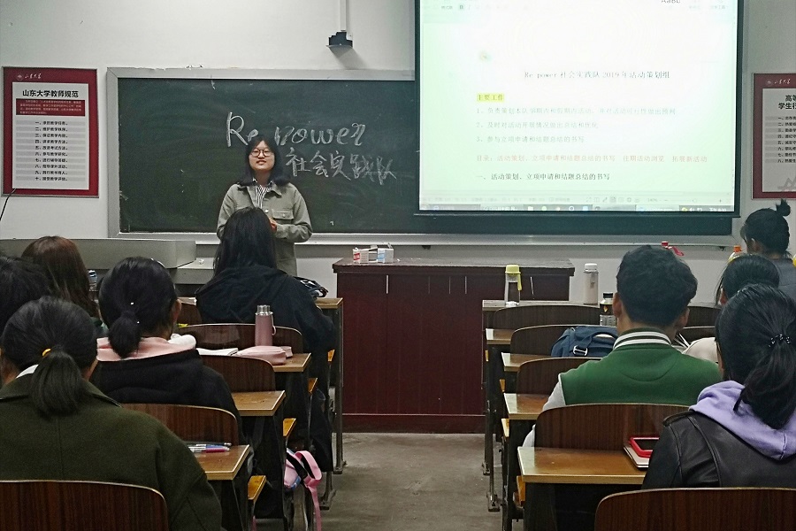 3月24日,Re-power社会实践队2019年新老成员见面会于趵突泉校区8114教室举行。此次活动由Re-power社会实践队举办,队长和各组组长担任主讲人,新老成员到场参加。