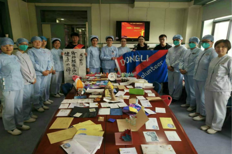 在我们进入的过程中,还被门卫爷爷拦下并询问了我们此行的目的。队员们彬彬有礼地说明情况:您好,我们是山东大学V动力社会实践队队员,来这里为奋斗在防核第一线的医生护士们,以及饱受结核病折磨的病人们带来充满真诚的问候,我们已经和这里的医生取得联系,希望您可以让我们进入,谢谢。然后队员们便在周围人赞许的目光中顺利进入疾控中心,随后我们到达了王美华所长所在的904办公室,所长倾听了我们的来意后,热情地接待了我们,并邀请了其他有空闲时间的同事们,我们将同学们精心制作的小礼物以及饱含心意的书信和明信片送给他们,并和他们聊了一会现在的结核病患病和治疗情况,体会到他们心怀热忱,一心为患的高尚情怀,对于医生这个职业也有了更深刻的认识和体会。