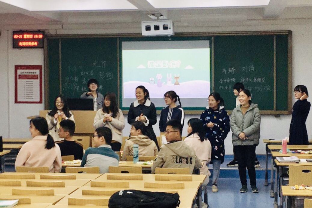 最后,见面会进入游戏互动环节。在游戏开始前,队员们通过先猜后证的方式分享各自名字的含义,增进了对彼此的了解。随后进行的是该环节的第一个游戏“谁是卧底”,队员们分为三组轮流参加游戏。参加游戏的组员们根据各自所得的关键词,加以描述并判断与其他成员所述词语的一致性。游戏同时规定,落败一方需接受挑战,具体要求为限定时间内轮流夸赞组员。游戏气氛热烈,教室内笑声连连。第二个游戏是“击鼓传花”,鼓停花止,得花者回答任一问题或接受挑战任务。游戏环节不仅增进了队员间的交流与合作,也让见面会的气氛更加轻松愉快。20时30分,见面会在欢快的氛围中结束。