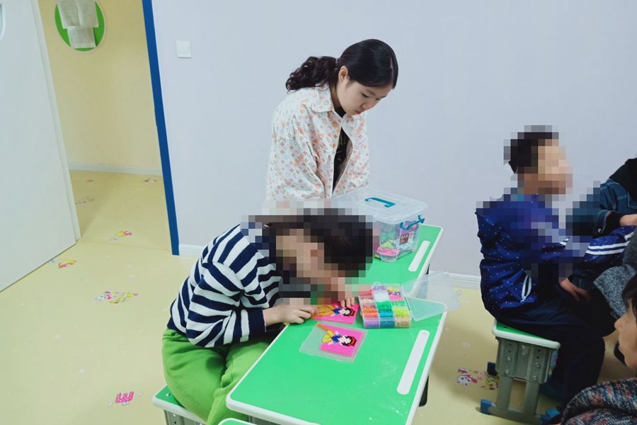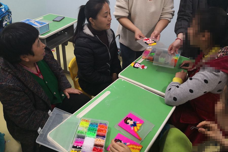 在此次活动中,志愿者们的主要任务是帮助孩子们完成短管拼图,训练孩子们使用镊子的精细动作以及比对图形的辨别能力。旨在培养他们的创作能力以及加强孩子们专注于活动的耐心。此次活动中的参与儿童,最小的孩子,年仅8岁。在辅助孩子们完成活动的过程中,一个13岁的大男孩给志愿者们留下了深刻的印象。他时而发呆,含手,时而敲打自己的脑袋,重复着自己的动作,让人感到心酸。于是,志愿者们采取了转移他注意力的方式。效果显著,在志愿者的耐心引导和不懈坚持下,他逐渐减少了重复的次数。