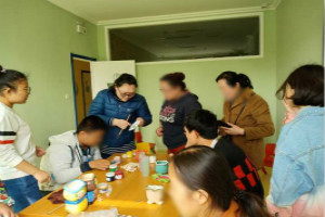 特训内容是做陶艺,以一种引导孤独症患者参与对颜色的调节活动的方式,激发他们对未知事物的兴趣。首先,指导老师向志愿者和学生们讲解画笔的使用方法,后拿出三原色颜料向大家演示调色过程。与志愿者的预想一样,学生们都感觉像发现了新大陆,立刻提起了兴致。接下来学生们都选择了自己喜欢的花盆,在家长和志愿者的陪同下开始了创作。志愿者以足够的耐心引导孤独症儿童练习涮笔、涂色、换水等过程,并不断用语言鼓励他们。