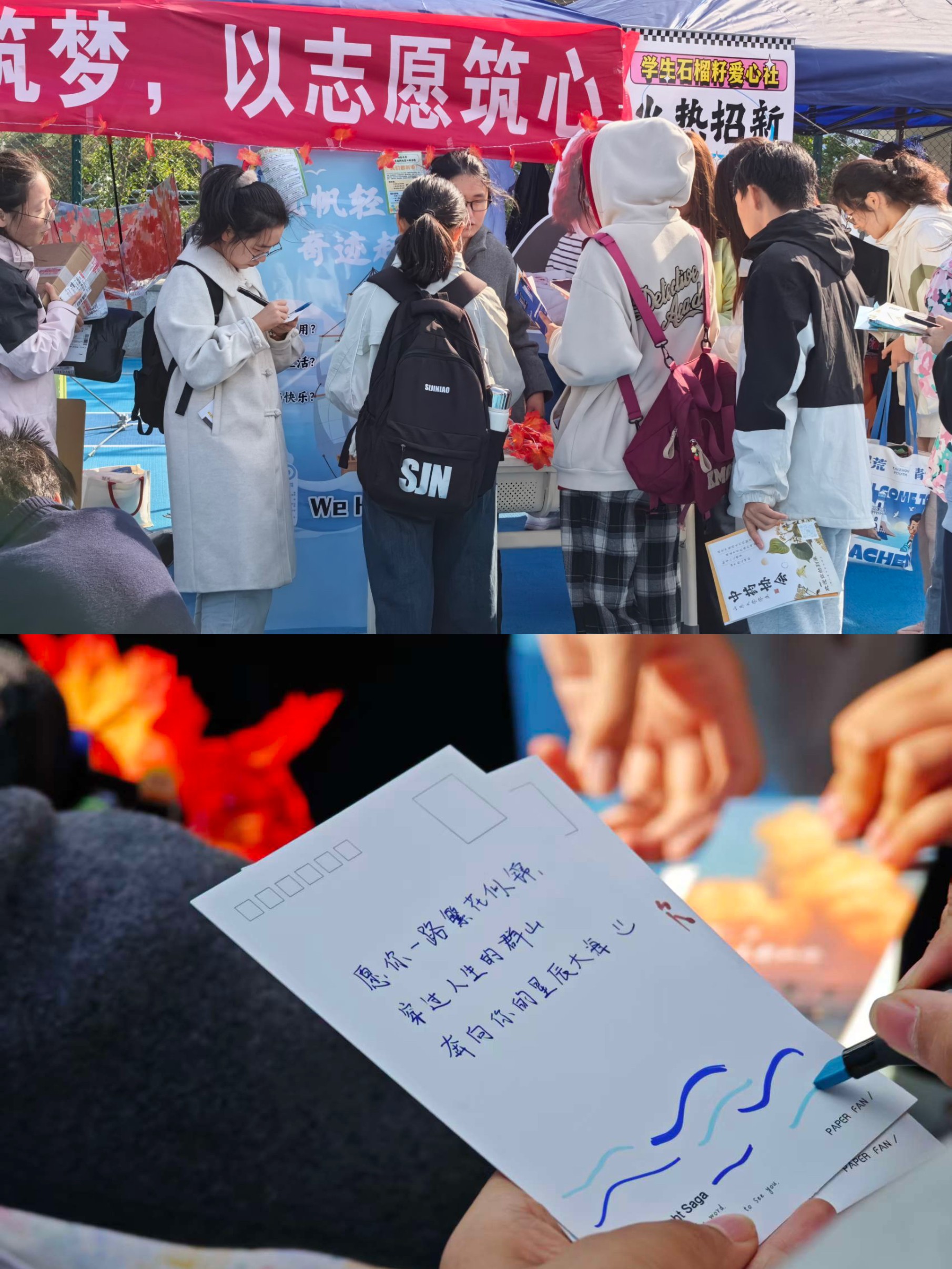 在山东大学学生奇迹风帆爱心服务团的展位前,同学们正专注地制作寄给山区孩子们的秋日问候。同学们在明信片上认真作画、写下祝福,向远方的孩子们传递问候与鼓励。奇迹风帆爱心服务团采用了线上线下联动模式:线下手写明信片传递温度,线上同步推出校内风景照片收集,向山区孩子们展示校园的美好生活。一张张情谊真挚的明信片映照了山大学子的热情关怀,也实现了美感与情感的双重传递。