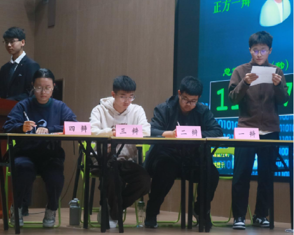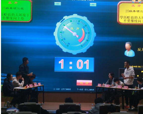 本场辩论赛的辩题为“学历贬值的大环境下要不要继续向上卷”,正方为25级本硕三班代表队,反方为25级本硕二班代表队。校辩论队成员李雨恩、刘骁恩、谢云鹏受邀参加并担任评委,对整场比赛双方综合表现进行评估并打分。