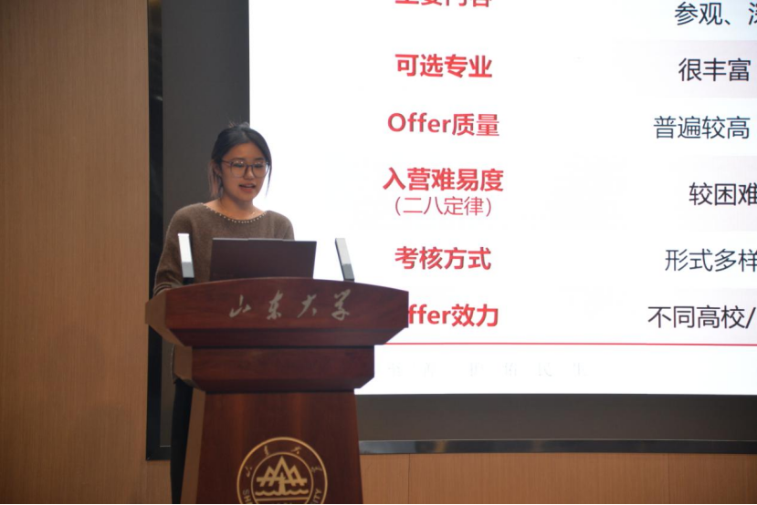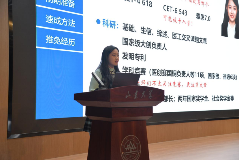 随后登场的是已直博北京大学肿瘤医院肿瘤内科的朱亚萍学姐。作为国家级大创负责人兼山东大学学术创新部部长,朱亚萍学姐首先为大家理清了学位选择的注意事项,接着她又以系统解剖学和精神病学等学科为例分享了自己的日常学习方法。同时,学姐也为英语四六级分数不理想的学弟学妹们贴心地准备了英语补救方法;为苦于推荐信难求的同学们准备了推荐信获取流程;为忙于专业课学习的同学们准备了专业课速成方法,可谓干货满满。最后,她联系个人推免经历,为大家生动解释了“强/弱com”、“铁offer”这些专业术语的含义并鼓励大家主动互帮互助、共同进步。