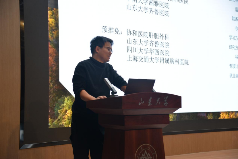 最后由已被推免至山东大学齐鲁医学院外科学的谭满学长进行分享。在经历一轮的夏令营与预推免后,谭满学长深深意识到英语成绩的重要性,他感慨道,“优异的英语成绩是争取更多选择机会的敲门砖”,并告诫学弟学妹们踏实学习英语。接着,按照内外科的当下热门程度,他以个人见解分别对内科与外科各二级学科进行了排名并逐一分析。最后,他在结合本校优势后向学弟学妹们倾情推荐了数位优秀的硕士生导师与博士生导师后,表达了对同学们的成功推免的期待。