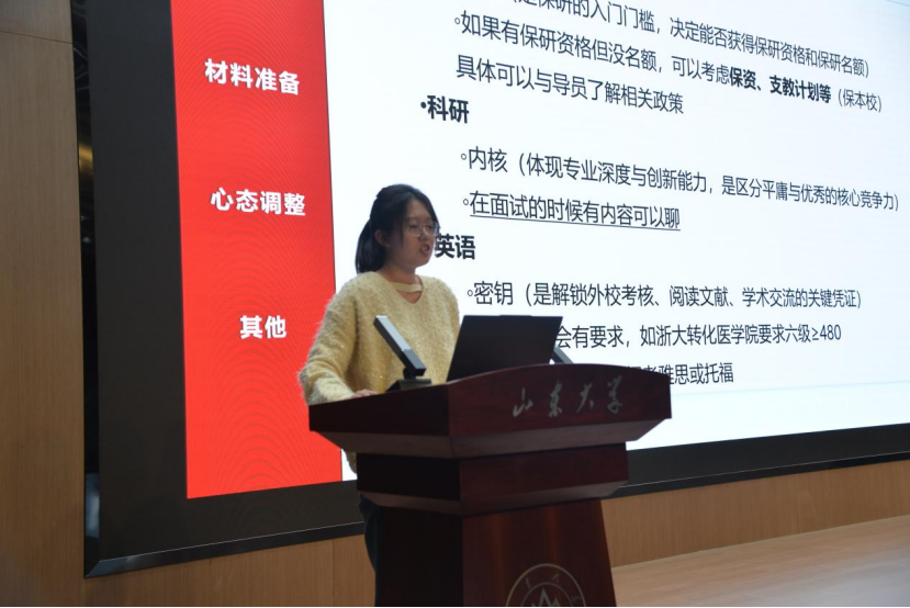 11月22日晚,山东大学基础医学院第三十九届“医路成长”系列讲座——保研分享会在医道大学堂召开。本讲座由基础医学院本科生党支部联合第二临床学院本科生第一党支部共建,旨在帮助基础医学院临五、生医科同学提前做好保研规划,并向已获得推免资格的优秀学长学姐汲取保研心得。