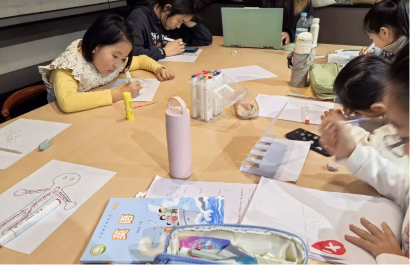 在理论科普环节,队员们面向二至六年级学生系统讲解了血液组成、血细胞功能、ABO血型及输血安全等知识。创意绘画环节则引导学生运用立体画、四格漫画等技法,将血液与血型知识转化为视觉作品。最终的寻宝活动通过游戏化设计,让学生在社区中寻找并回答预设问题,实现知识巩固与趣味实践的结合。